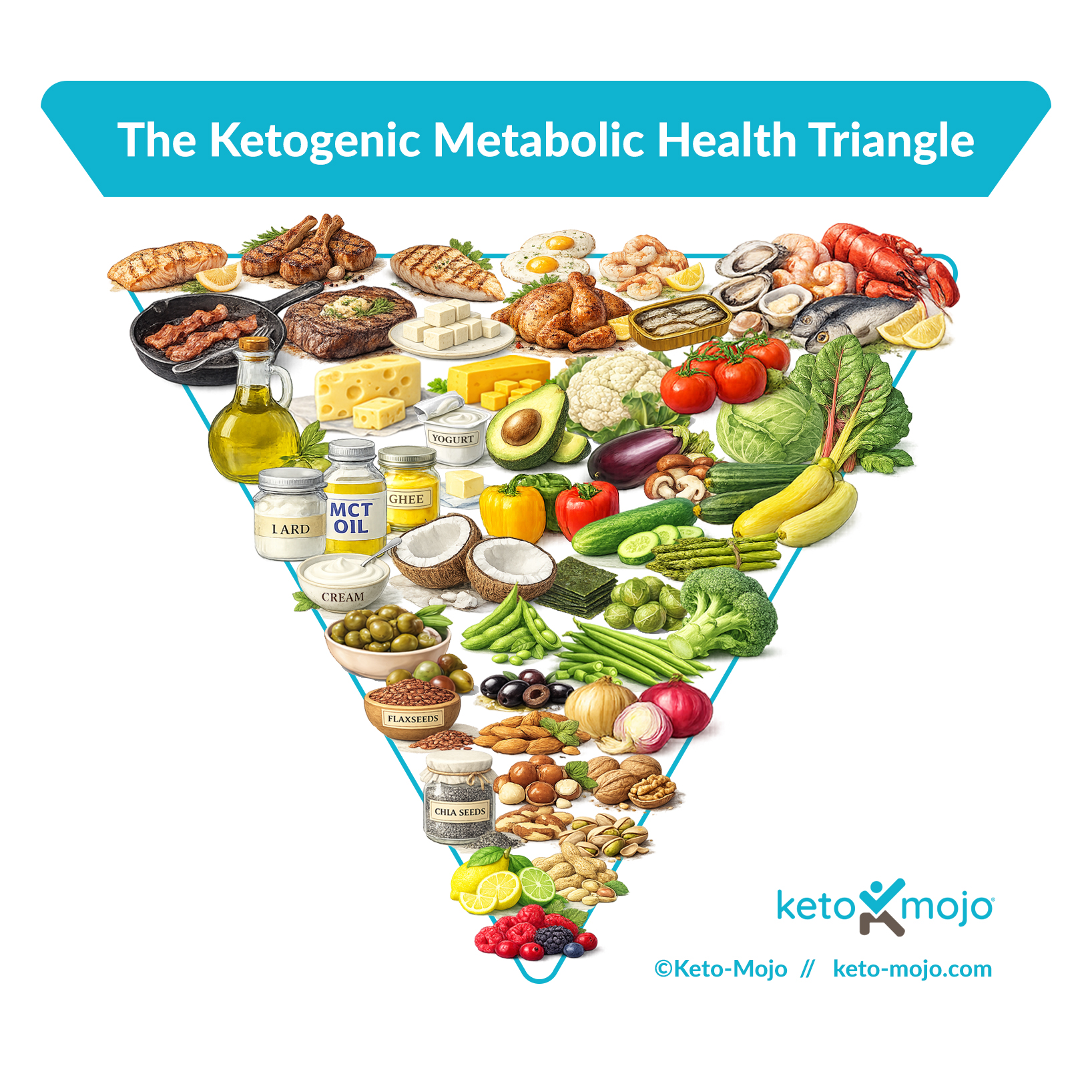 Building on this shift, we’ve created the Ketogenic Metabolic Health Triangle, an inverted food pyramid designed for people following a ketogenic lifestyle to support metabolic health and nutritional ketosis. (Note: This pyramid may not be applicable for certain therapeutic ketogenic interventions that require lower protein intake, such as those used to treat epilepsy.)
